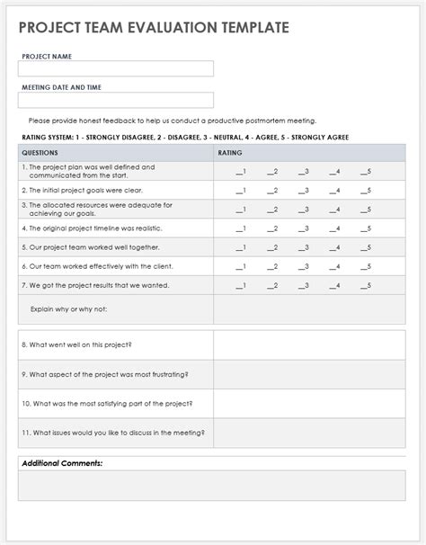 Use this form to let participants rate their assessment of project team meetings. A project evaluation template can report the activities and successes of a team, which can help them meet deadlines and achieve their visions. Use this form to evaluate work done by each member of your project team.
